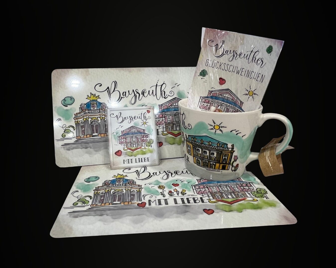 Die Artikel in unserem Bayreuth Souvenirladen haben einen spezifischen Bezug zu Bayreuth, zum Beispiel zum Komponisten Richard Wagner, Markgräfin Wilhelmine, dem UNESCO-Weltkulturerbe Markgräfliches Opernhaus oder dem Festspielhaus auf dem Grünen Hügel – perfekt für alle Bayreuth-Fans!