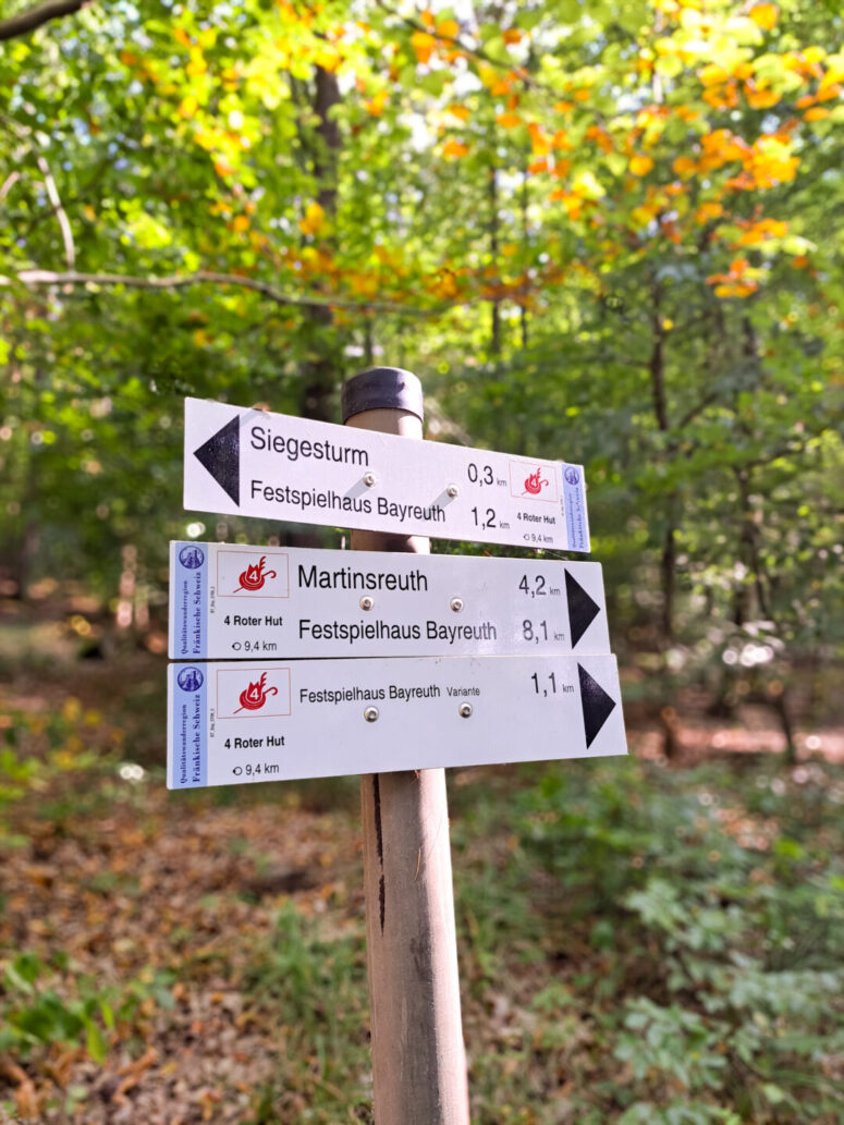 Den Festspielpark erreichen Sie, wenn Sie ausgehend des Hauptbahnhofes der Straße in Richtung Festspielhaus bergaufwärts folgen. Wer über etwas Ausdauer verfügt, der kann nach dem Festspielpark noch einen Besuch am Siegesturm einlegen. Hierfür folgt man der Straße „Bürgerreuth“ einfach immer weiter bergaufwärts bis man das angrenzende Waldstück erreicht. Die Tour geht in den Wald hinein und führt Sie bergaufwärts zum Siegesturm. Oben angekommen wird man mit einer wunderschönen Aussicht über ganz Bayreuth belohnt.