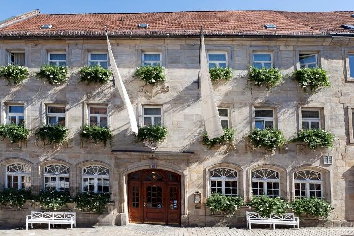 Historisches Steingebäude mit gewölbter Holztür, großen Fenstern mit weißen Rahmen und grünen Blumenkästen, braunen Fahnen über dem Eingang und weißen Bänken davor.