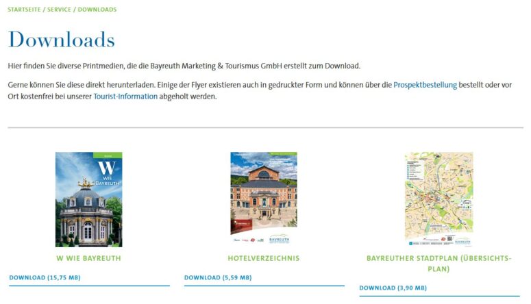 Falls Sie gerne sofort und digital Flyer erhalten möchten, anstatt auf Post von uns zu warten, besuchen Sie gerne unseren Download-Bereich, wo Sie zum Beispiel unser Unterkunftsverzeichnis oder verschiedene Stadtpläne herunterladen können.